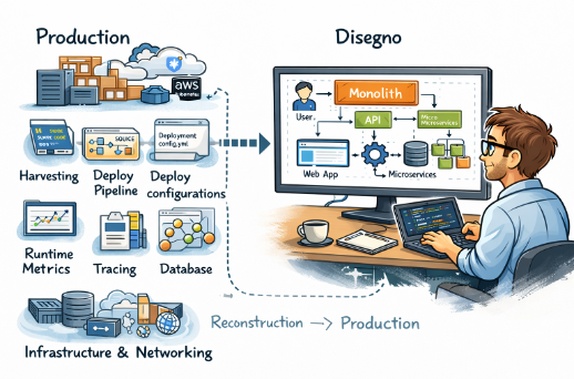 Se il top-down rappresenta la dimensione intenzionale del sistema, il bottom-up rappresenta quella osservabile. Infatti, l’approccio bottom-up parte dall’analisi di ciò che esiste realmente: codice, metriche, asset di deployment, configurazioni runtime, telemetria, informazioni derivate da API o da metriche infrastrutturali e applicative. L’obiettivo è ricostruire l’architettura as-is, ovvero il modello effettivo del sistema in esecuzione o dell’ecosistema tecnico implementato.