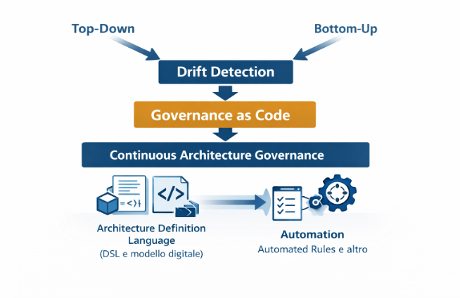 Gli approcci tradizionali hanno un limite evidente: molte linee guida architetturali restano ancora confinate in documenti lunghi e poco strutturati, spesso scritti in linguaggio naturale, e quindi difficili da trasformare in controlli automatici e ripetibili. Per questo è fondamentale estendere la logica dell’“as code” anche alla governance architetturale: codificare principi, pattern, ADR, Standard, reference, e vincoli in forma dichiarativa e versionata, così da costruire un architecture repository “as code”. Questo repository diventa il riferimento comune che abilita un modello standard di raccordo tra approccio top-down e approccio bottom-up, rendendo possibile confrontare intenzione progettuale e realtà osservata in modo continuo.